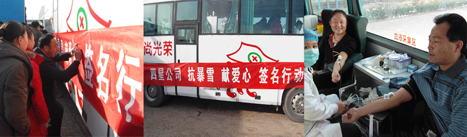 于2010年11月,河北省遭遇60年罕見的暴風(fēng)雪,相關(guān)地區(qū)受災(zāi)嚴(yán)重,一方群眾急需血液,但血庫(kù)供血告急,當(dāng)公司接到上級(jí)政府救援通知后,及時(shí)動(dòng)員全體職工無償獻(xiàn)血,奉獻(xiàn)愛心活動(dòng)。