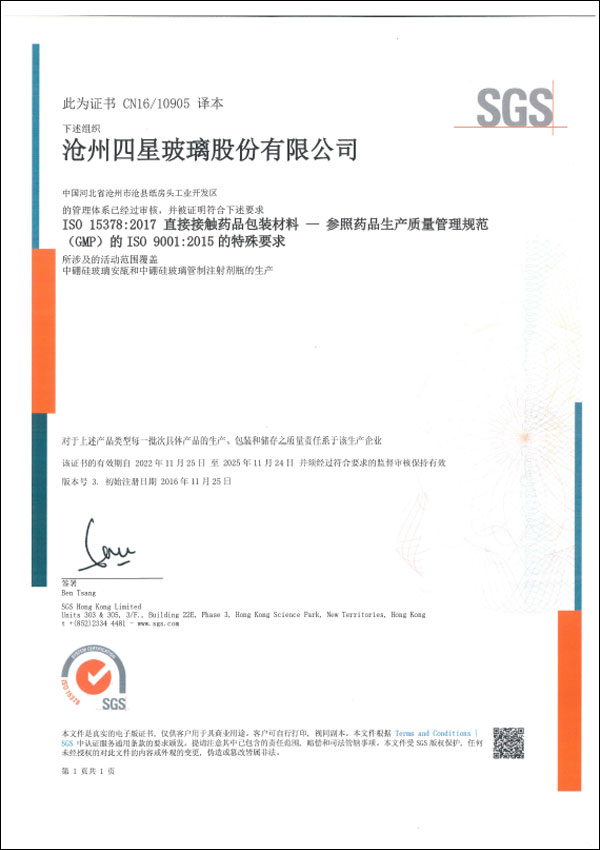 DMF西林瓶認證證書